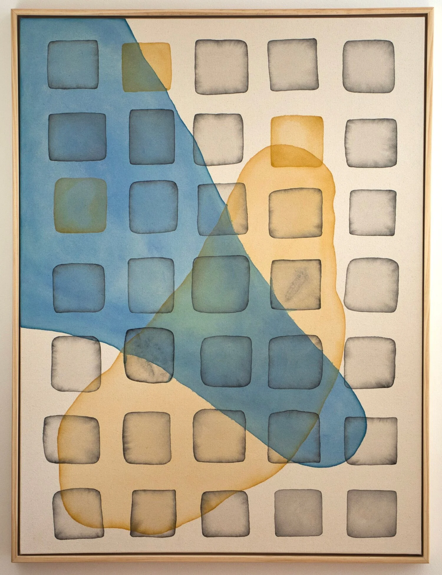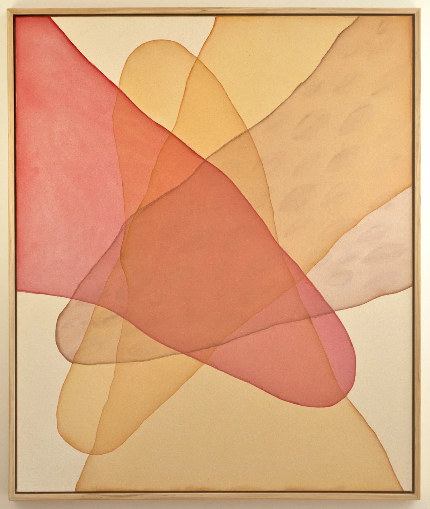 In pairing her abstract and figurative work together, Mirchandani paints a cosmic picture of her emotional voyage as an immigrant woman living in modern day America; from the gestural figurative representations of shifting mental states down to the abstracted, microscopic moments of emotion imagined. This juxtaposition in style yet analogous in concept can be seen in the coupling of her figurative painting, This Must Be the Place, and her abstract painting, Collide Into You. In the first, the artist draws us into a couples’ intimate embrace, a shared private moment in warm shades of orange, burnt Sienna and red, their limbs intertwined and heads close as they hold one another in an infinite pool of water. In the other, similar abstract shapes and shades of color overlap with one another from various angles, coalescing in the middle of the canvas and reiterating feelings of warmth, belonging, and love. The contiguity of these artworks, their simplified organic shapes, captivating color palettes, luminous layers, and active line-work involuntarily evoke a plethora of familiar emotions.